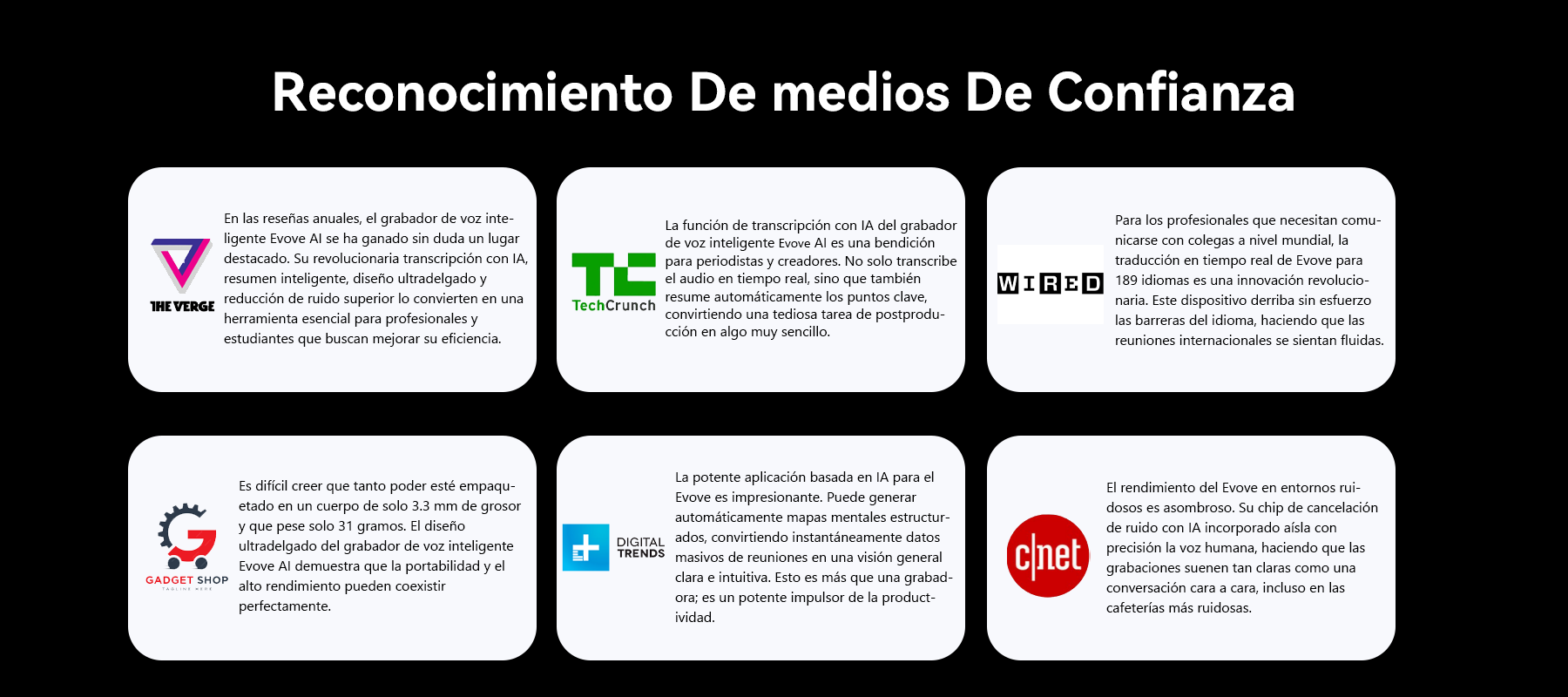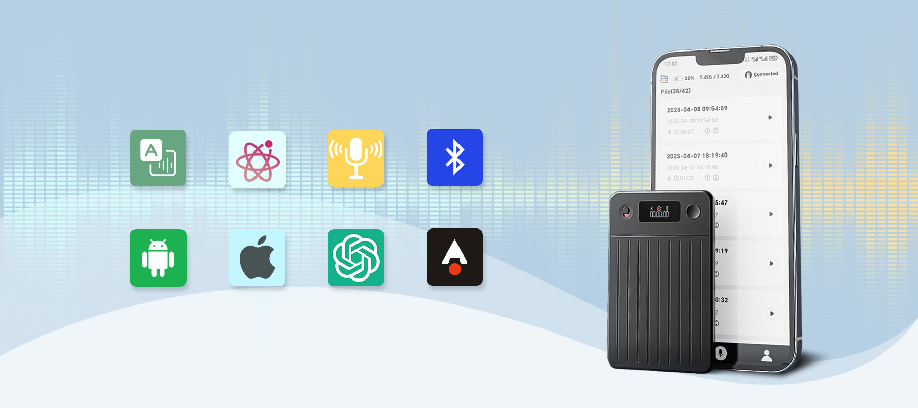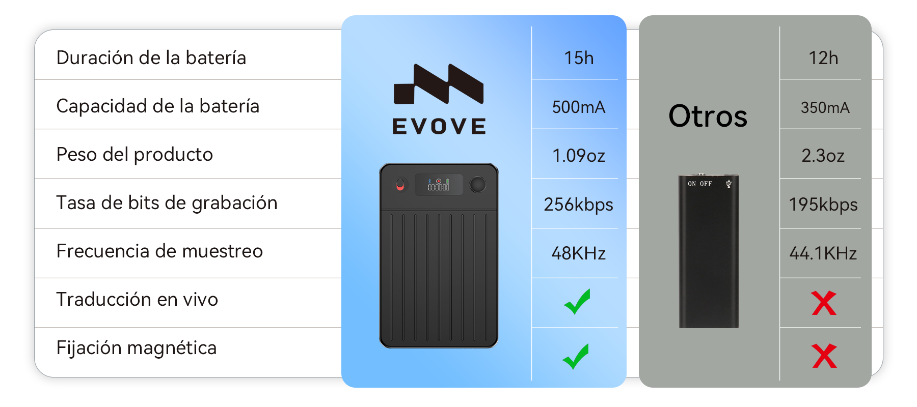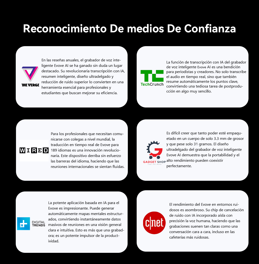 Así nació la Grabadora de Voz Inteligente Evove. Cuenta con un potente motor AI para transcripción en tiempo real y resúmenes inteligentes, y su cuerpo ultra-delgado incluye tecnología de cancelación de ruido AI integrada, garantizando una calidad de audio impecable. Esta es la promesa central de Evove: liberar tu mente y permitirte concentrarte en lo que realmente importa.